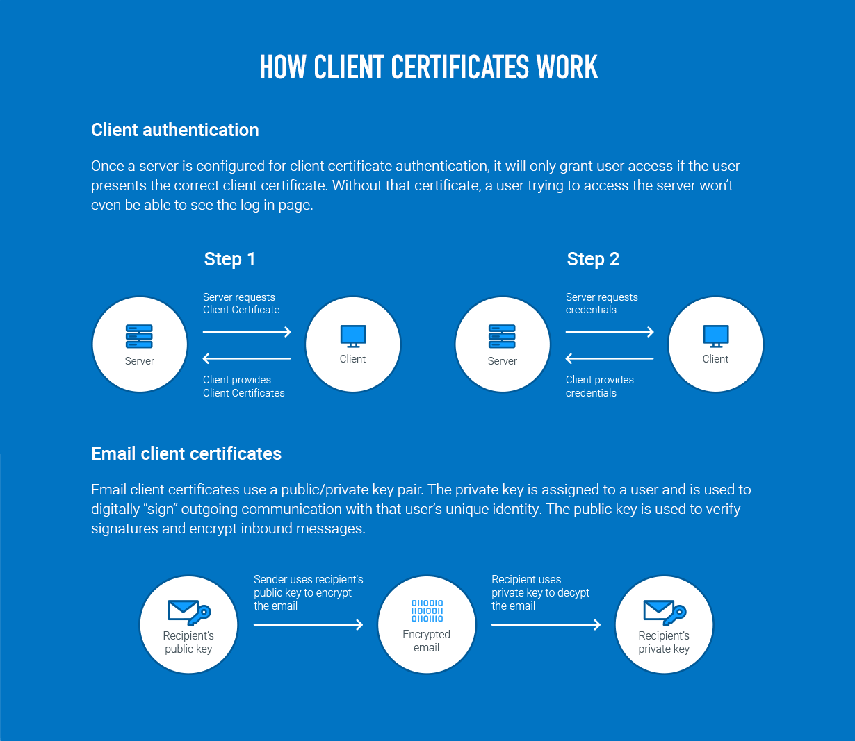 Without two-factor authentication (2FA), email signing, and document signing, your organization is only as secure as your weakest password. Client certificates-also known as personal ID certificates-are used to concretely identify and validate individual users. That way you're able to control what each user can and cannot access and encrypt and sign communications they send and receive.